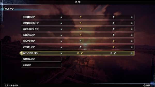 5、在游戏设定中,玩家可以自定义开启或关闭反击辅助设定、武将邂逅动画、兵器动画、照片优先模式等等;