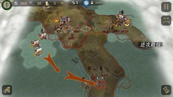 本关目标是占领4个关键地区,击败5支关键部队,16回合内达成目标。首先要尽快占领科隆这个5级城,补给部队。之后德鲁苏斯会向后撤退,可以在中途截杀。敌军重甲部队比较多,可以多出一些双手斧兵来应对,便宜又好用,是日耳曼尼亚部落对抗重甲部队性价比很高的单位。但是自身比较脆,要注意配合其他部队保护。按照图示路线占领所有关键地区即可。