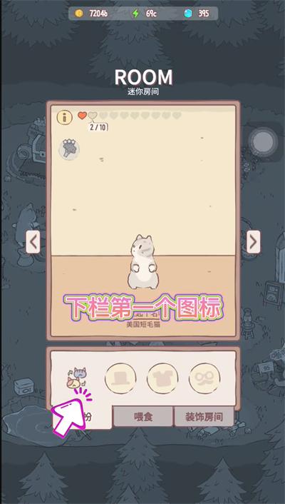 1、点击猫咪,再点击“猫”图标