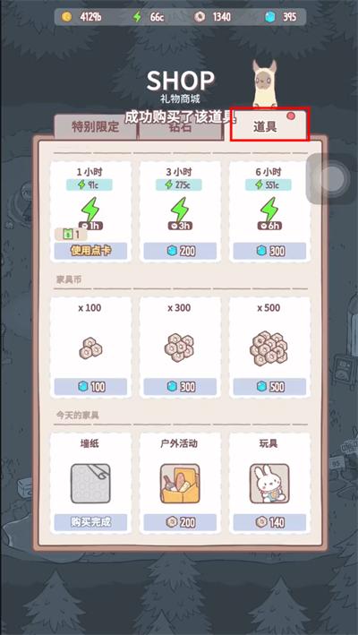 2、点击“道具”,拉到最下面可以买家具