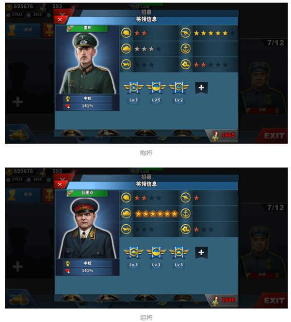 将领主要分为步将、坦将、炮将、海将和空将,铜将区的前期过渡将我推荐:步将海因里希/梁兴初/温盖特
