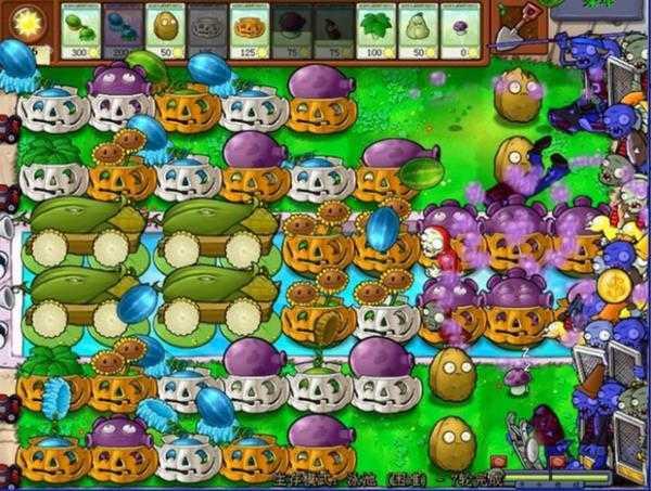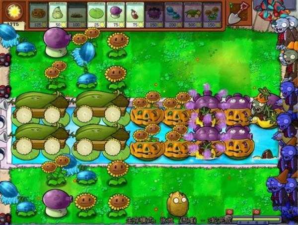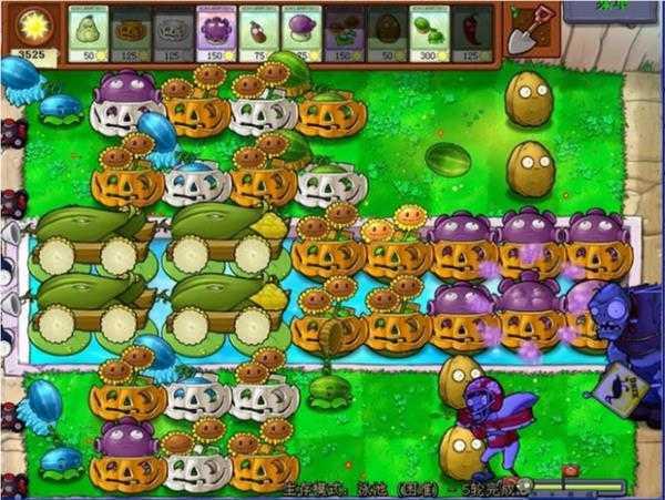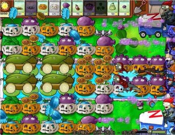 最可怕的僵尸是炸弹僵尸,当炸弹僵尸的音乐出现时,别犹豫,就是一个炸,可以适当选用炸弹,还有,炸弹僵尸出现时,可以选寒冰菇,缺点是费钱,以防万一,炸弹僵尸上阵时要选上睡莲、大喷菇、咖啡豆,以便随时补上战斗力,如果阵容完整,巨型僵尸和冰车顶多走四个格子,所以没什么可怕的,注意后路不要被矿工僵尸吃掉,随时罩南瓜罩(如下图所示):