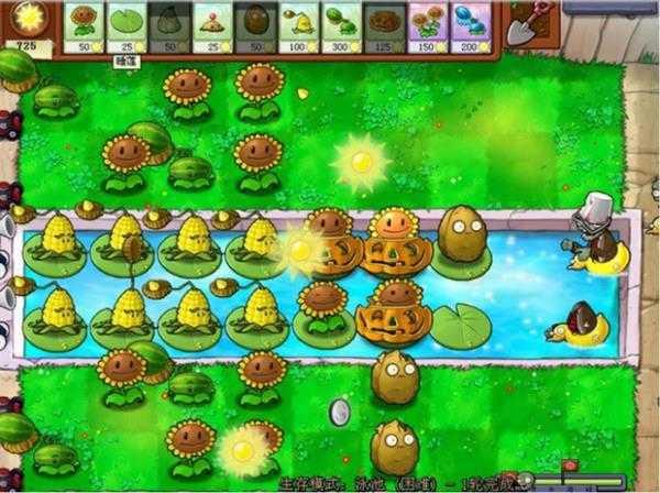 布局十分重要,陆地必须要放4个西瓜,每行两个太阳花,必须留出如图所示的空格,水路后4排放玉米投手,紧接着放两排太阳花,必须要有南瓜罩,因为水底会冒出僵尸啃,以防万一,太阳花前面可以放小坚果墙保护,这关以攒太阳为主,所以攻击力是倭瓜和土豆雷,僵尸一共能走4个格子,所以事先在第四个格子埋好,倭瓜留着危急时刻用,你懂得,水路救命用可以放海草(如下图所示):