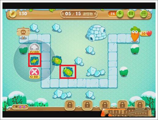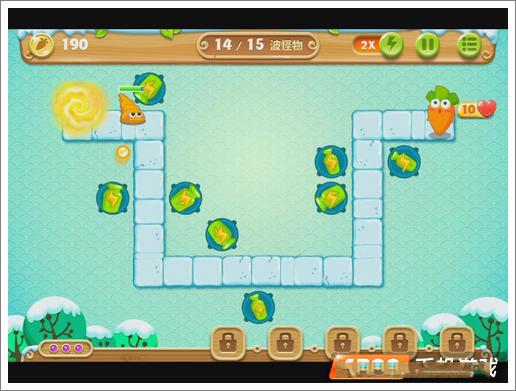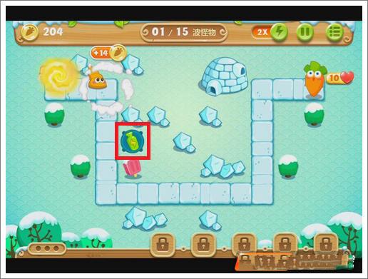 1、保卫萝卜2第35关首先在怪物的出口处放置一个瓶子炮塔,在怪物出来的时候造成伤害。