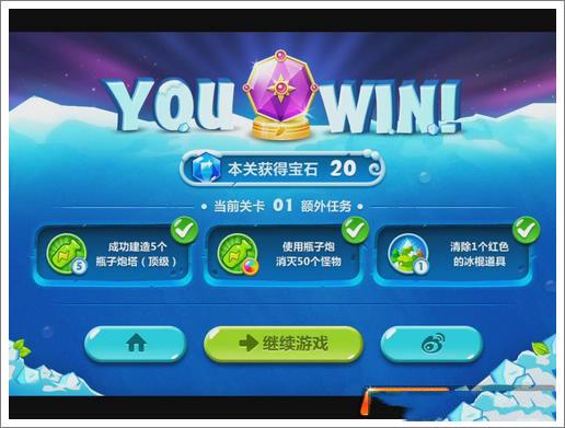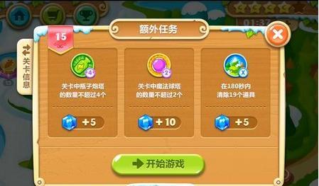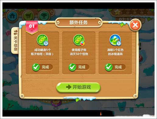 3、额外任务:成功建造5个瓶子炮塔(顶级) ;使用瓶子炮塔消灭50个怪物;消除1个红色冰棍道具。