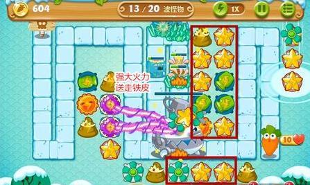 3、铁皮的前进似乎不可阻挡,在铁皮走到,开始在右边的空地布置火力。瓶子炮、炸弹星各2~3个。左边可以放便便塔来延缓铁皮行动,为后场争取时间。