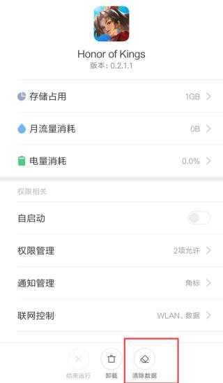 在手机应用管理系统找到【Honor of Kings】,选择清除数据,清除全部数据和缓存,再加速重启游戏。