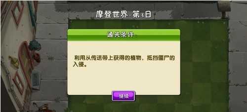 摩登世界第3日过关条件:利用从传送带上获得的植物,抵挡僵尸的入侵。
