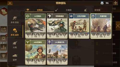 除装甲车战斗机自带轻机枪克制步兵外,步兵可上阵特种部队增加克制属性,如掷弹兵增加百分之42对装甲部队伤害,减免收到装甲百分之25伤害;苏瓦基骑兵增加对步兵百分之35伤害,减免收到火炮百分之25伤害;特种部队收到一定伤害会消失,变为普通部队