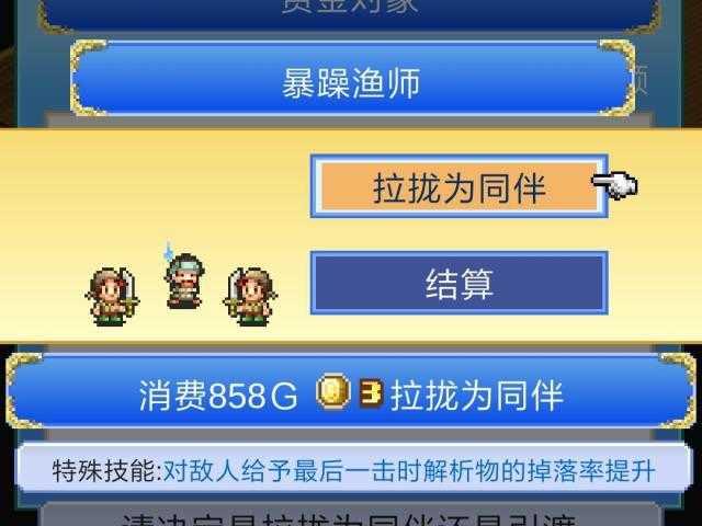 最后的推荐就是一定要抓到开局的那个渔夫。渔夫的特殊技能就是对敌人给予最后一击时解析物的掉落率提升,小编大概估计了一下差不多有80%!这个渔夫就在隐藏图里,轻而易举就能刷出来。俗话说的好,养一个渔夫就能养活一整条船,所以开局抓到的这个渔夫可以富养他,把葡萄酒葡萄酒、橙子之类的加经验的物品都可以喂给它,前期基本上就可以不用发愁了,后期再养几个高星级的渔夫就再好不过了。