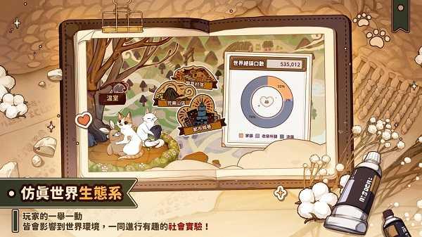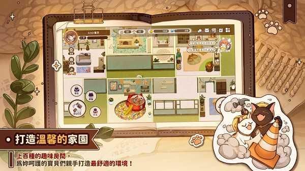 特殊的房屋建造构成,玩家可以在游玩过程中不断扩大居住地,自行搭配许多不同的游戏功能房间,给予猫咪们更舒适有趣的居住环境,在房间中也有许多神秘物品能让猫咪做出独特的互动,仅是静静的看着它们也能感到十分满足!