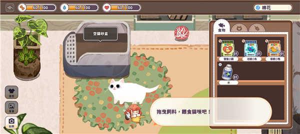 等带回猫咪后还能帮它们取名字。接着从左下角按「饲养」,点击进去后最上面可以看到猫咪的状态,看看你的猫饿不饿,渴不渴还有心情如何,依照猫咪的情况我们就可以将食物、道具或猫砂拖曳到猫的身上,但有时候喂食,主子还不一定会吃呢,毕竟每只猫的口味也是不一样的。