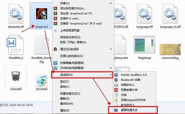 3.找到【empires2】.exe的应用程序(注意,所选程序必须是这个名称,否则无效!),使用鼠标右键选择【发送到】-【桌面快捷方式】即可,再次点击桌面快捷方式就可以直接进入游戏了!