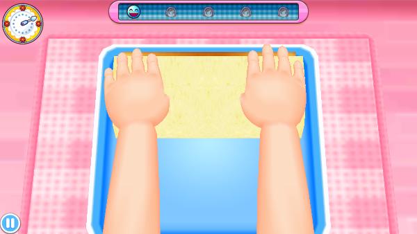 8、第六步把蛋糕卷切成薄片这样你就完成了蛋糕卷的制作啦,完成之后你就会解锁新的菜谱啦。