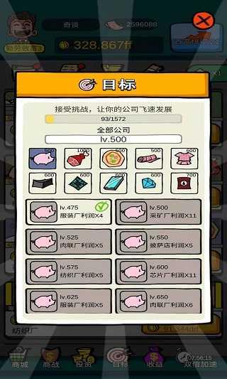 游戏中玩家的首要目标就是赚他个10个亿,从最基层的开设养猪场,肉联厂、披萨店开设,到最终的石油、珠宝行业,都能够让你体验到经营的不易,期间每开设一个公司都会给予你的一定的资金奖励。