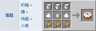 简单来说,蛋糕的配方是牛奶*3桶+糖*2 +鸡蛋*1+小麦*3,是用来恢复饥饿值、饱和度的食物,玩家们出门探索时可以带上一些!