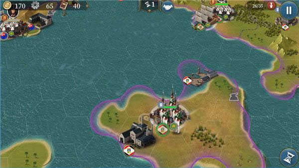 3、地图界面,左上角分别是经济,工业,和类似文献一样的东西,大胆猜测这个可以用来升级科技,此外,上部海岸炮虚体化了,可能变成了工事类型,而要塞依然实体化。巴黎旁边的凯旋门看的挺变扭,应该是奇观(实体化奇观),而且似乎没有防御,可能可以被占领,左上角可以看到城市的城防,人力(猜测),经济,工业,文献。