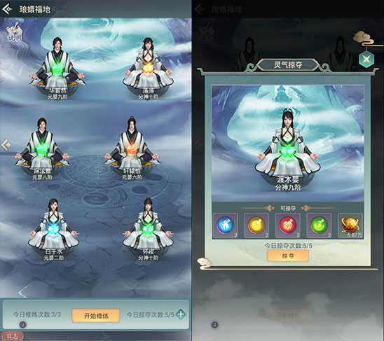 7、琅嬛福地是一处修炼圣地,达到分神境之后方可进入,每日可借助福地灵气,打坐修行获得额外的修为和丹药,修炼前可选择提升灵气的品质,每天有3次免费提升品质的机会,灵气品质越高修炼的效果越强。但在此处福地中,斗争也是存在的,每日都有机会可以对其他修行中的修者进行掠夺,掠夺成功则夺取对方一成的修炼收益,当然,在你修行之时,也将出现更强者,前来掠夺你的修行成果。
