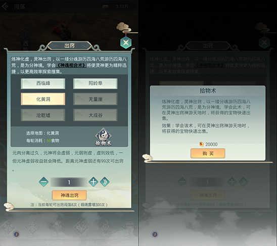 6、达到分神境之后即可开始出窍,出窍需要学习指定神通。习成后即可不用手动探索战斗地图,使用出窍即可扫荡已通过关卡的产出物品,出窍依然需要消耗食物和时间,关卡越强,食物消耗越多,若再习得拾物术,即可选择直接变卖获得的低品级道具,来积累灵石。