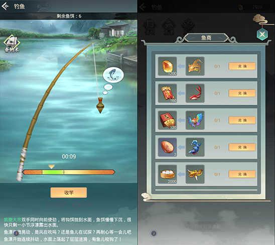 9、每天可以参与两次钓鱼活动,如果拥有天宫官职则可以获得额外次数。每次钓鱼将拥有6个鱼饵,至少需要拥有1个鱼饵才能抛竿,鱼咬勾后出现进度条,在合适的时机收竿即可钓到鱼,没有咬勾时收竿将不消耗鱼饵。钓到的鱼和鱼贩换取各种资源。