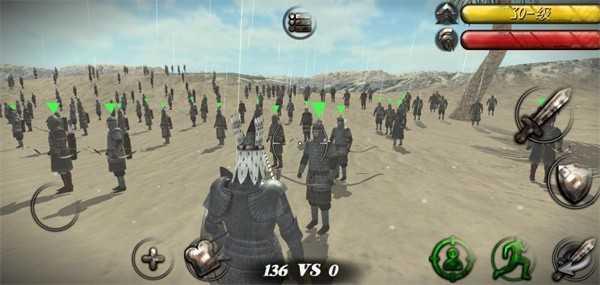 1、点击进度条右边的第一个按钮可以选择士兵的战斗阵型,不过兵力少时这个没什么用。我们的角色则是通过左下角的方向按钮控制移动,屏幕上有剑的按钮是攻击按钮,盾牌的是防御按钮,手指在屏幕上滑动来调整我们的视野。