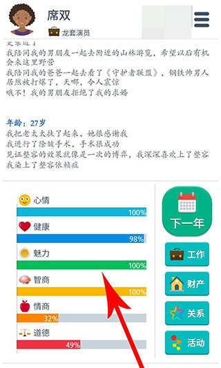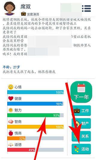 1、在游戏中,大学毕业之后,当您看到自己的魅力值偏低的时候,就急需快速增加魅力值,方法是点击游戏主页右下角的“活动”