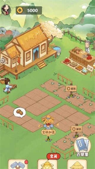 2、进入游戏后点击【开始赚钱】,然后点击空地种植草药。在订单列种植好点击“加速”,就可以加快草药的生长,快速成熟。