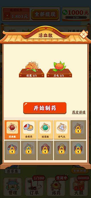 5、各种制药配方,抓取合适的药材依法炮制,不断丰富自己的中药库存。