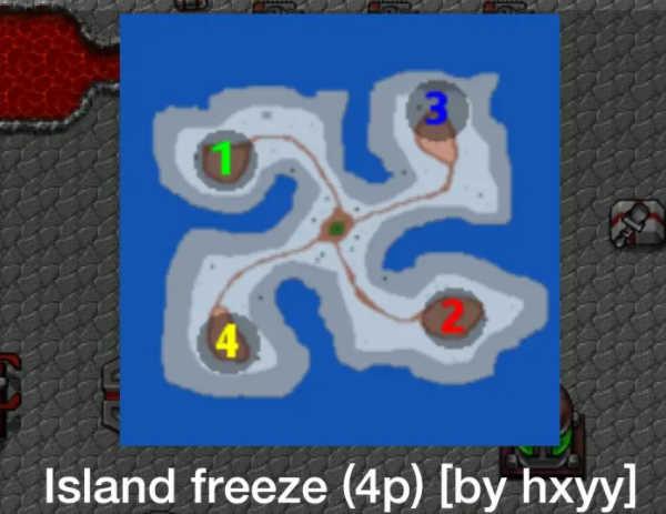 因场地开阔,矿点众多,适合运用机动性较高的陆军和空军抢夺或打击资源点。开局机械场小机甲,开局陆地工厂出小坦或主力坦克,空军基地出轻武直或武直,均是不错的选择。在上图中,整体陆地面积较大,空军机动性优势明显,有不错的发挥。而下图的陆地面积仍不足以发挥空军优势,再结合性价比等原因,最适宜打法是开局二级工厂出主力坦克。(备注:沙漠地图和island freeze的地图面积大小可作为空军以及一些低科技兵种使用效率的临界点。临界点上方开始,小坦克等低科技高产出效率的兵种和空军开始适宜使用)(具体原因1:低科技兵种产出前提低,可以迅速出来干扰战场,压制建造者建造野矿或压制击杀对面在野侦查者,而本方建造者可以安然建造资源点获得经济优势,而过多制造低级兵种会影响性价比更高的二级工厂主力坦克产出到达前线资源点,即而被反制。具体情况应结合地图大小判断,上述地图提供了一个临界值。)(具体原因2:地图面积越大,矿点越多,空军能控制骚扰的地点就越多。而空军的劣势即性价比大部分低于陆战对空兵种,若资源点较少且集中于一处,在重坦等主力陆军到达矿区夺取经济然后后起空军反制会陷入劣势,甚至基地亦会受到坦克群威胁)