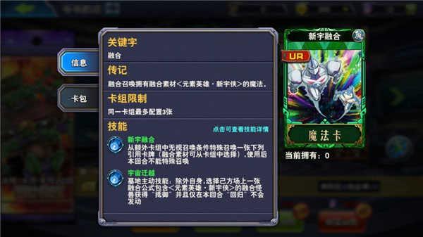 The second,新宇融合。新宇融合是一个非常强大的先手卡片,为什么说是先手呢?使用这张卡之后本回合就无法特招了,如果你的手牌同时有新宇融合和融合以及融合素材那将会是一个比较尴尬的局面,如果你选择使用新宇融合那么你的伤害能力就大打折扣无论你召唤谁也无法达到一回合秒杀的威力,如果你不使用他而是发动手中的融合,又难以保证会不会吃到对方的陷阱,毕竟普通的融合召唤方式可以极为亏卡的,如果被对手1换3那可就亏大了。如果先使用新宇融合被对手“1换1”虽然没亏但是本回合不能特召了,以目前决斗之城的发展趋势,空场的你被秒杀的几率可以说是99.99%。但是先手可以完全避开这些疑虑,就召唤海洋新宇侠破坏对方一张手牌!或者召唤风暴新宇侠站场(苍离个人推荐还是召唤海洋新宇侠让对方亏卡比较划算,进攻就是最好的防守!)除此之外新宇融合还有墓地主动效果(和某些墓地主动效果不同,新宇融合进入墓地的当前回合和以后都可以发动),可以选择一张融合公式包含元素英雄新宇侠的怪兽无视一次破坏,并且回归效果不会发动。这样的效果如果是648一张其实并不为过!既然策划推出这样的卡进入限时狂欢给大家作为福利,喜欢这张卡的朋友可千万别错过哦!