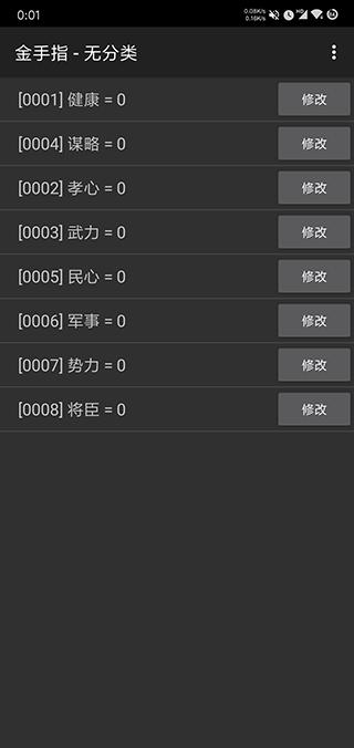 2、在主界面点击“橙光”--->“金手指”,如下图所示,玩家可以根据自己的需求修改健康、谋略、孝心、军事、民心、势力等属性。
