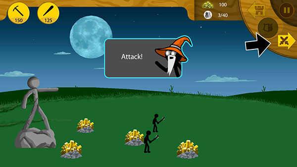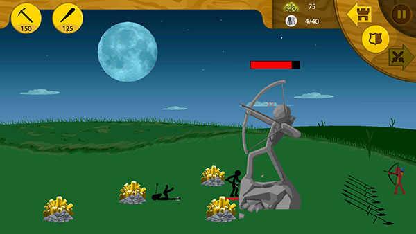 5、火柴人战争遗产游戏屏幕右上角有三个按钮,向左的箭头按钮点击后,我们的所有火柴人都会退守到基地后面, 当敌人来攻击的时候,只有弓箭手可以攻击到敌人,不过这也会造成我们基地的损耗。