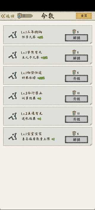 命数:花费命数点解锁和升级命数,每局可继承,可以按需选择,目前看来作用不大。有点数分配的情况下按钮亮起,无点数可分配时是灰色。可重置,点击右上角重置后可以重新分配。