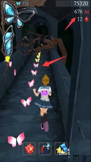 进入游戏,开始进行跑酷关卡,过程中尽量多地获得蝴蝶,提高通关的评分,获得更多的金币。