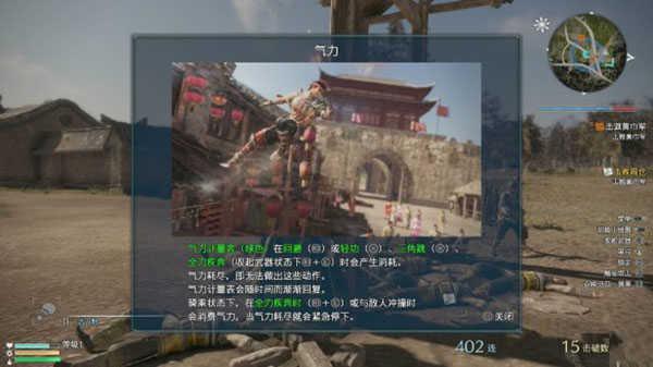气力和回避系统:游戏中的绿色计量条就是气力,这个系统和“怪物猎人”、“黑暗之魂”等系列相似,人物进行加速奔跑、回避和轻功时都会消耗。在骑乘状态下加速奔跑和冲撞敌人也会消耗气力槽,气力槽消耗完后马匹会有抬起前脚的硬直动作,所以建议气力条尽量不要消耗完。