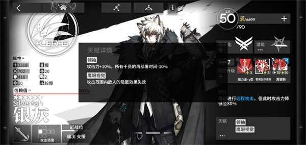 五星干员,攻击造成法术伤害,各项属性较为均衡,符合五星的设定。二技能提升更高的攻击力,多连发,随机攻击范围内的目标,唯一拥有三个技能的五星干员。三技能,奇美拉,增加攻击力和生命上限,无视敌方物抗法抗,但30s后强制退出(和剧情相呼应)。获取难度极低,初始角色,主线2-10、3-8、4-9首通获得。