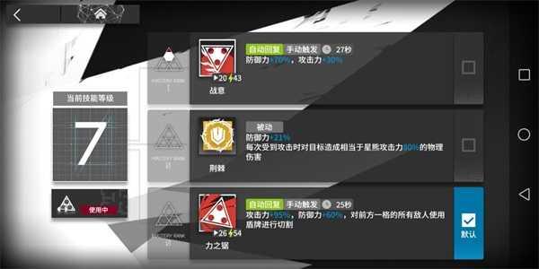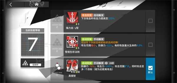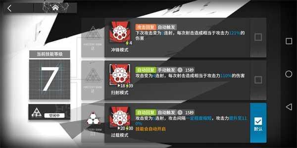 过载模式(专精后才会增加攻击力):常应用于高压开局、针对boss的迅速击杀或者是复杂快速清场,有着较强的降压能力,但由于该技能的攻击提升效果不明显,导致面对物抗较高的敌方单位时会被迫沦为“抛光机”,且自动化设定致使需要对整体节奏有所掌握