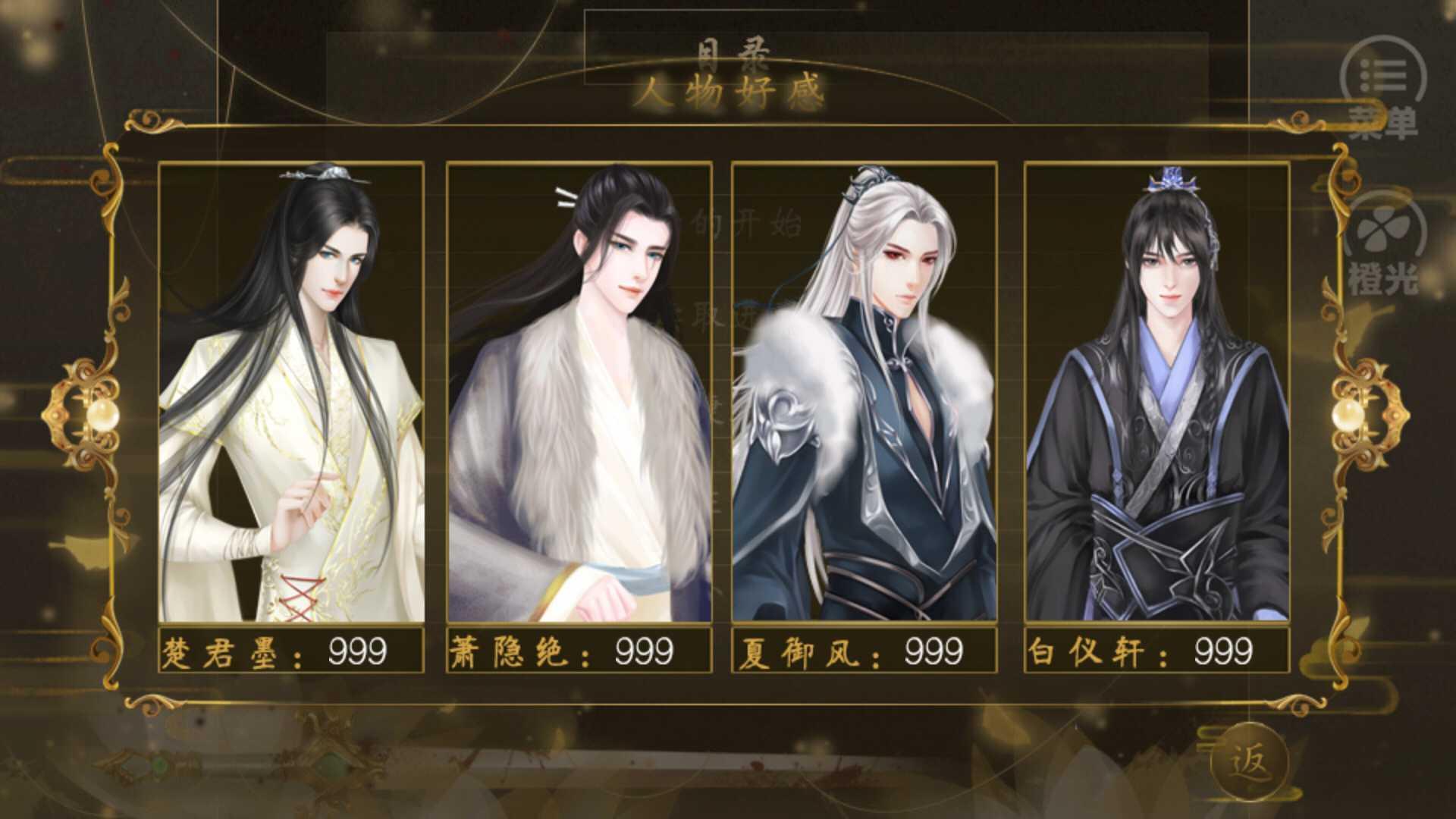 4、故事好看,不傻白甜,感觉作者还是蛮用心蛮理智的,里面的角色都有头脑,性格各种各样。原配楚君墨性格加分,敢爱敢恨,金句不断,存在感十足,贫起来招人喜欢,一开始的确不对付,但是在外人面前护短,拎得清,我很欣赏这种性格。虽然限于客观条件爬墙失败,但是主观上积累了不少好感,我还是比较希望达成他的结局。不过游戏很长啊,有点玩不下去了。毕竟现在要复习准备考试,而且囊中羞涩,估计就玩这几个小时吧。感谢作者的辛苦劳动,游戏很棒。