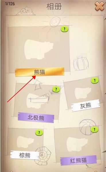 2、游戏中动物非常多,其中,熊猫是最受热捧的,本例讲下如何引来熊猫,按下底部书卷的标钮,打开“相册”找出熊猫所显的框此。