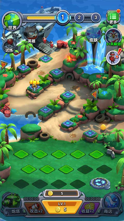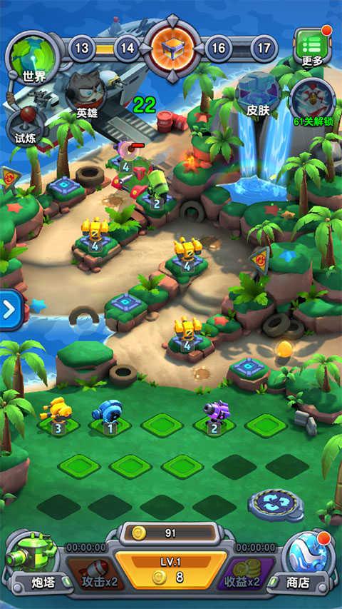 2.合并升级炮塔,有策略的搭配各类炮塔,抵抗不同的敌人。