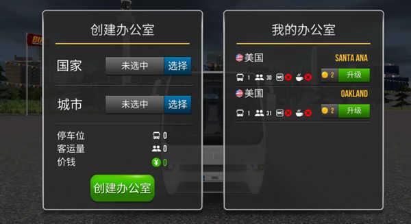 要解锁地图目前只有两种方法,第一种就是购买,第二种是过任务系统赠送。购买非常简单,我们进入游戏之后点击上方的终点站,这里提示我们要创建新的办公室。我们选择好国家和城市之后就可以点击创建办公室了,但是小编在这里提醒大家,目前中国的地图还没有做出来,只有其他国家的一些地图。但这些也够我们玩了,要想玩中国地图的话只能再等等了。