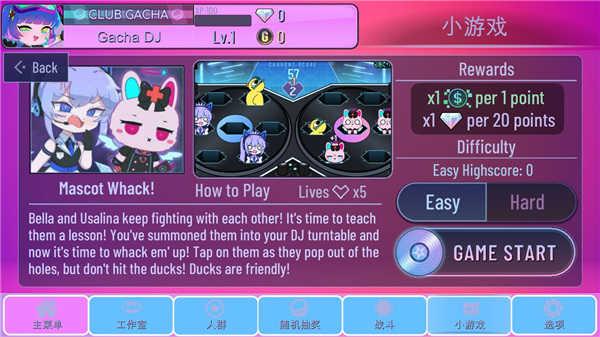 与打地鼠类似的模式,在这个小游戏中Bella和Usalina会从界面中的DJ工作台上左右两个碟子中的6个孔出现,其中还包括鸭子。玩家在本游戏中有5次机会,漏一次或打中鸭子则扣一次,扣完游戏结束。Easy难度下每1分可获得2倍Bits,每20分可获得一个Gems;Hard难度下每1分可获得1倍Bits,每20分可获得一个Gems。