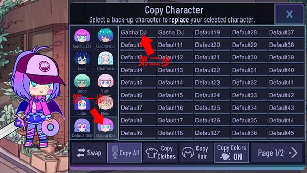 2、接着来到人物备份界面后,左侧为我们当前已创建角色,右侧为角色备份区域,如果我们要复制某个角色的话,首先在左侧选中想要复制的角色后,再点击右侧备份区域中的某个Default选项,来将我们的角色备份至备份中