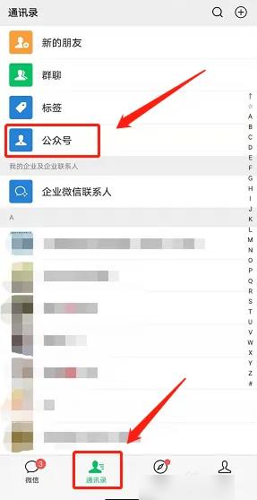 首先在手机上打开微信APP。在通讯录选项下找到【公众号】。