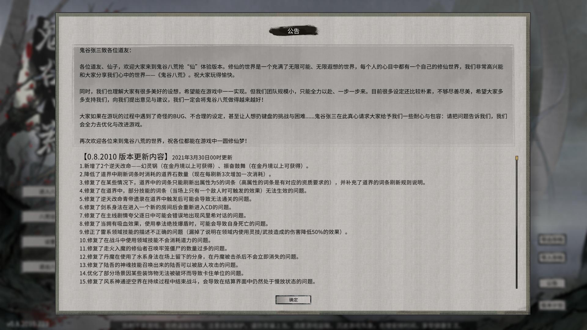 鬼谷八荒0.8.2010吾爱破解版是3月30日最新更新的游戏版本,游戏的玩法和内容非常丰富,超多的道侣可以双修,还有仇人和师徒功能,更支持捏脸,全新的战斗体验,在冒险中不断的变强!