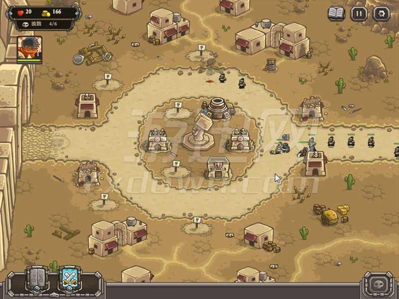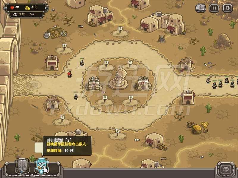 攻略:本关的重点在于死守中央路口,初始布局建议左侧弓箭塔,魔法塔;中下部弓箭塔,炸弹塔;右侧弓箭塔;中部步兵塔,弓箭塔(参考图片一)。有资金后在中部补充1座弓箭塔,1座步兵塔以稳固中央防守,增援还是冷却就用。然后升级,本关的塔可以升1级,优先升级中央的步兵塔,然后是左侧的魔法塔,再后是中央的弓箭塔和中下的炸弹塔。本关二级沙漠兵较多,在其于中央集中时用火雨。后期可酌情在后方补箭塔,总的来说本关难度不大,我通关时还有600多金。