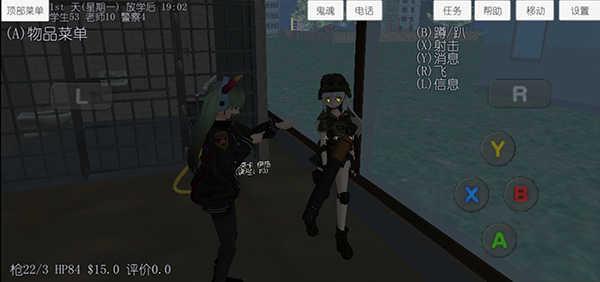 然后看上图,一进游戏我们就会在自己的房间里,左上角显示了日期时间以及人物数量。一共有48个学生,每个人都有自己的编号,女主是3号,在一班。这个女主身上也有写的啦!左下角显示了血量,饥饿度,先有资金和评价。饿了记得吃饭,学校门口有两家买东西吃的店,一个比较大的有两个女仆,基本咱们学校的人都来这吃,还有一家小黑店,买到的东西是随机的,有一会我买到了一个僵尸头没仔细看就吃了结果变成了僵尸QAQ学校里教学楼左边也有一个餐厅,有一个老师负责卖东西,老师不在是买不了的。右上角这竖的一排就是告诉你每个键是干嘛的,B是摆姿势的,可以趴着跪着躺着等等。X就是攻击键,Y是展开显示一些功能。