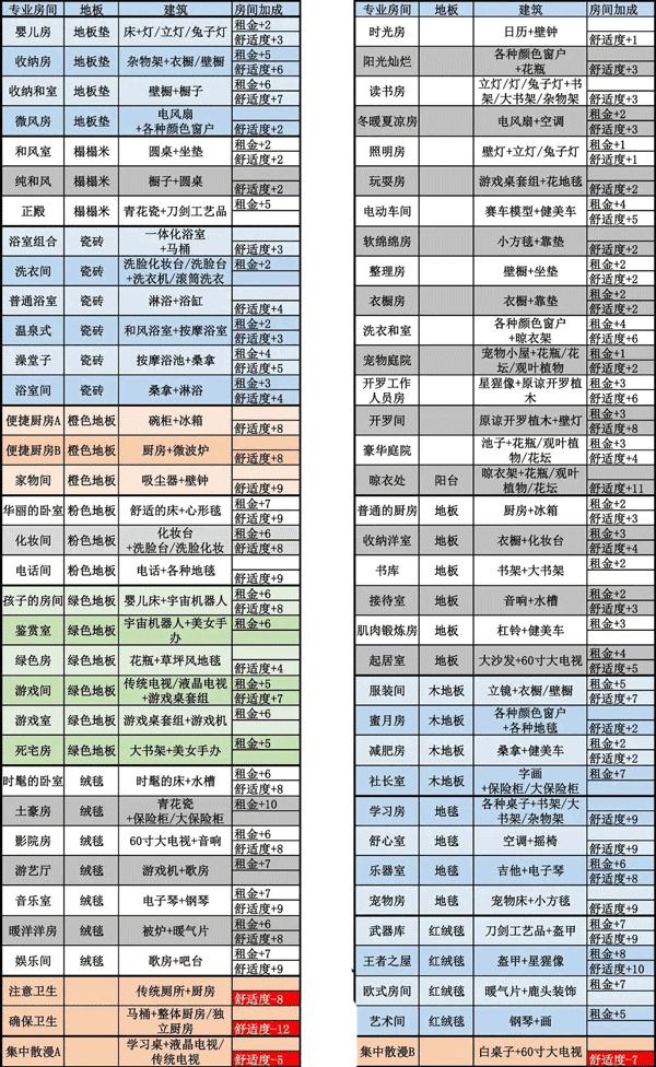 当居民的收入高出房租一定程度时,我们可以通过规划各种专门房间来提高房屋舒适度与房租。关于专门房间的“配方”可以在【菜单】 》【情报】 》【专用房间】里面查看。