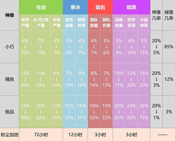 1、每种属性的大雕像只能立一个,中属性神像没有数量限制(当前版本最高神庙可以立12个神像)