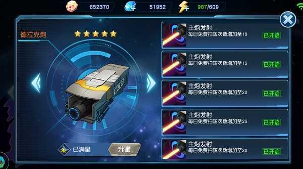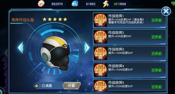 辅助装置的主要作用是让玩家更加有效的快速的升级增加游戏体验,每颗星都会提升一定的效果,其中作战头盔增加战斗结束经验,德拉克炮增加免费扫荡次数,这两个有条件的同学建议五颗星。